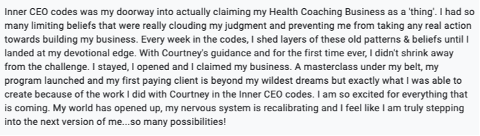 This is the inner evolution that re-codes how you do business, relationships & self-expression…so you can expand and become the woman who actually lives the life she desires, not just journals about it.